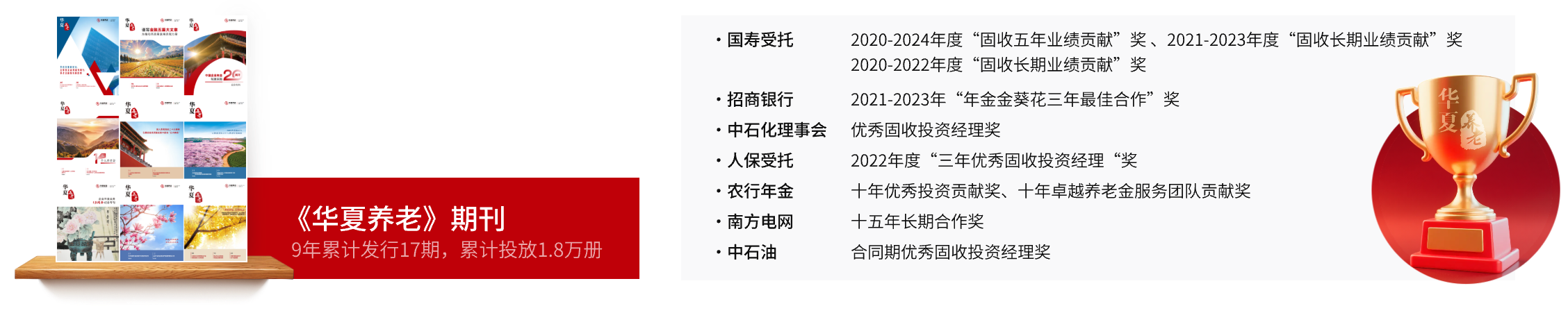 拥有超过120人的年金专属服务团队,业务骨干人员服务经验 超10年 。坚持 “以客户为中心” ,建立年金专业服务体系,提供高效、高质、便捷的专业服务,持续输出一站式优质专业内容,悉心打造“华夏养老”品牌,深受年金客户和受托人信赖。